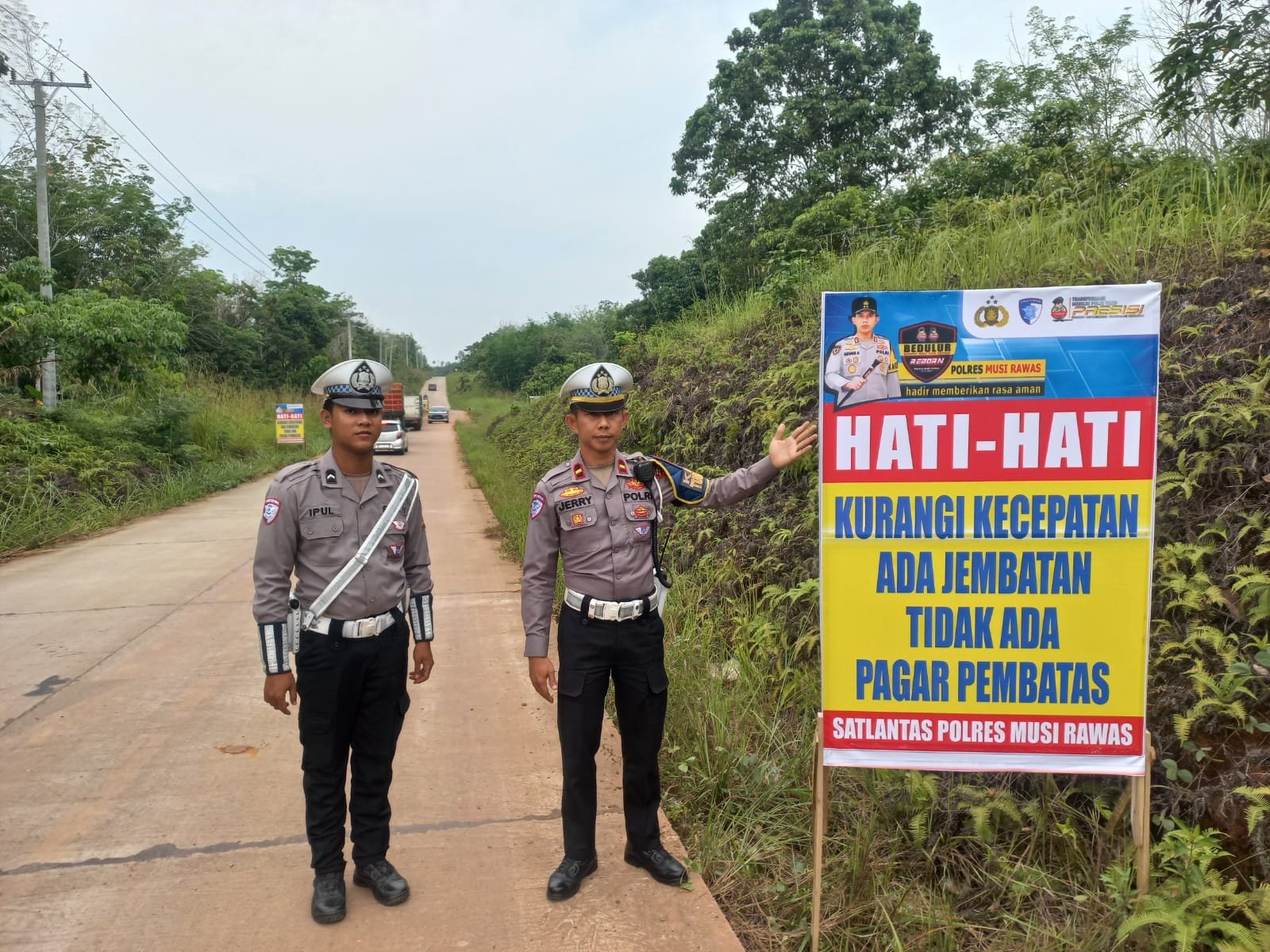 Kasat Lantas menjelaskan, adapun pemasangan spanduk himbauan tentang “Hati-hati Kurangi Kecepatan Ada Jembatan Tidak Ada Pagar Pembatas”.