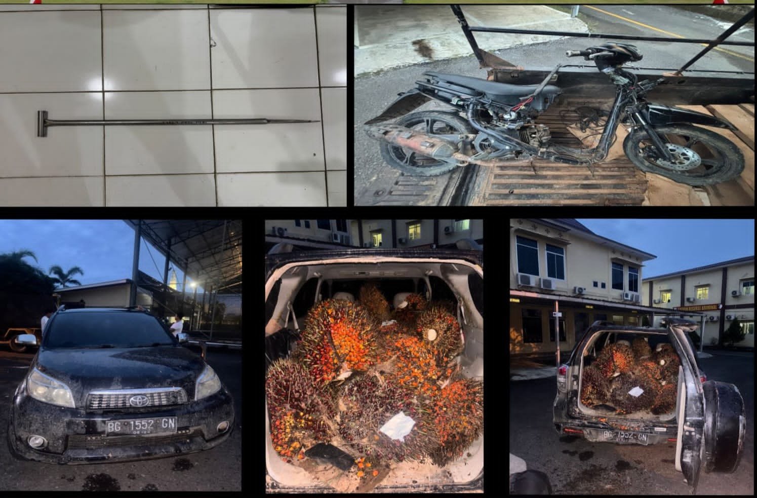 Barang bukti yang berhasil diamankan berupa 35 janjang buah kelapa sawit dengan berat total 1.015 kg senilai Rp3.557.575, satu unit mobil Toyota Rush, satu unit sepeda motor Yamaha Mio, serta satu buah tojok sepanjang satu meter yang digunakan untuk memanen sawit.